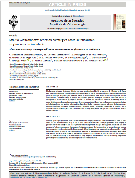 Citar: Hernández-Barahona J, Cabanás MC, Rodríguez de la Rúa E, García de la Vega M, García MA, Balonga D, García J, Hidalgo Á, Martín T, Maravilla P, Pachón M. GLAUCOINNOVA Study: strategic reflection on innovation in glaucoma in Andalusia. Arch Soc Esp Oftalmol.. 2026;[Epub ahead of print]. doi:10.1016/j.oftal.2026.502470
