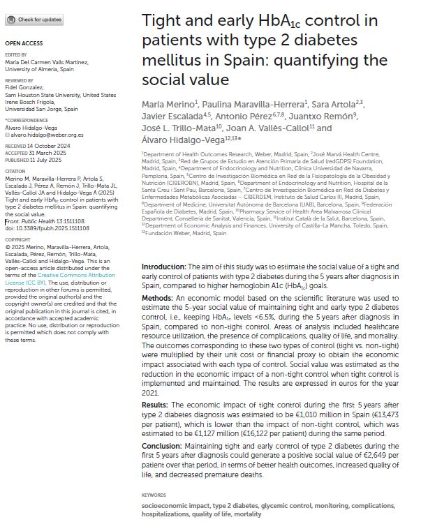 Cómo citar: Merino M, Maravilla-Herrera P, Artola S, Escalada J, Pérez A, Remón J, Trillo-Mata JL, Vallès-Callol JA, Hidalgo-Vega Á. Tight and early HbA1c control in patients with type 2 diabetes mellitus in Spain: quantifying the social value. Front Public Health. 2025 Jul 11;13:1511108. doi: 10.3389/fpubh.2025.1511108.